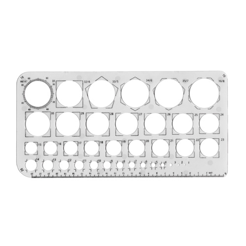 A transparent 13cm × 26cm stencil for drawing circles up to 36mm in diameter in 1mm increments. Features a 230mm ruler and a circular protractor graded in 5° increments. Each corner of the stencil is cut to a different radius for drawing 90° circular arcs.