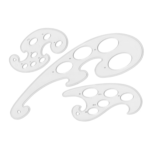 Set of 3 French Curve templates for design drawings. Made of transparent plastic for easy positioning, they can be used to draw smooth curves of almost any desired curvature. Approximate lengths: 13.5cm, 17cm, 32cm.